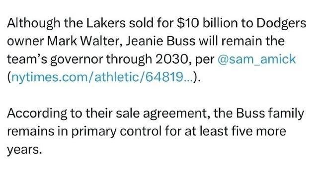 不过如今根据名记Sam Amick报道,他透露珍妮-巴斯实则未来5年依然是湖人的掌舵者:“湖人最近以100亿美元估值出售MLB洛杉矶道奇老板马克-沃尔特斯,但未来很长一段时间仍然会由珍妮-巴斯来管理。根据一个湖人的消息源透露,巴斯家族和沃尔特斯,以及NBA达成的协议中,明确要求珍妮-巴斯将继续掌舵湖人至少5个赛季。”